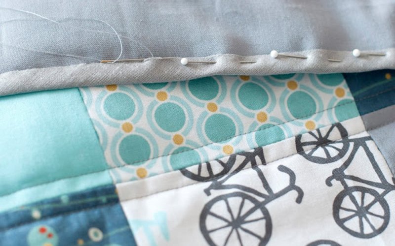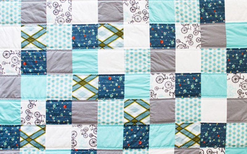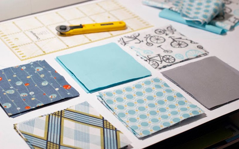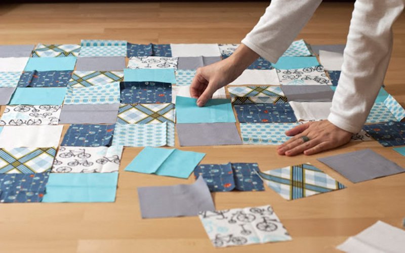 «быстрые квадраты» — берется две разных ткани, из них вырезают два прямоугольника, сшивают длинными сторонами, шов отпаривают утюгом. Из третьего куска контрастного материала также вырезают прямоугольник, который пришивается к заготовке. Из таких блоков получаются весьма оригинальные узоры;