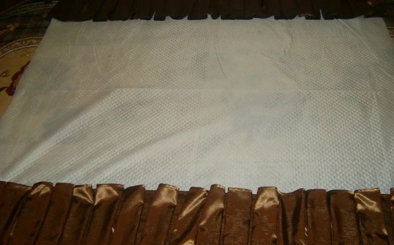 после к верхнему полотнищу пришивается основа, подкладка, оборка. Срезы последней оформляются косой бейкой либо оверлоком.