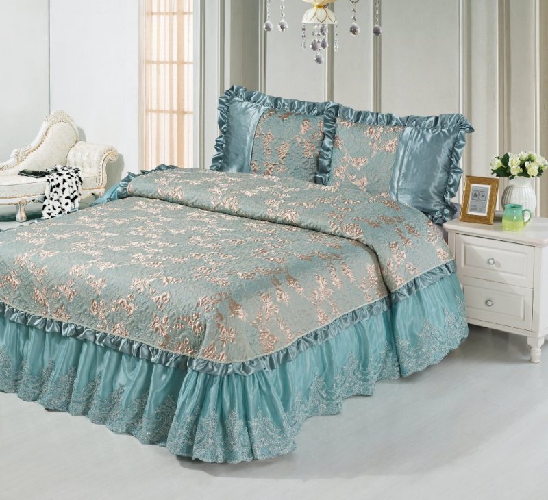 Когда покрывало украшено подзором, подобный элемент дублируется в оформлении туалетного столика, кресел, стульев. Кисти, бахрома, оборки, бусины, стразы, бантики обычно размещаются по контуру изделия, чтобы не мешали сидеть и лежать на нем.