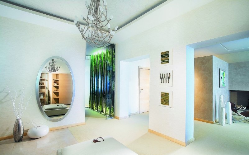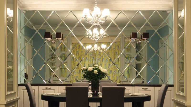 Для расширения пространства нередко используют зеркала во всю стену. Подобные полотна необходимо оклеивать специальной противоосколочной пленкой. Если панель будет разбита, покрытие не позволит тяжелым фрагментам упасть вам на голову. Они останутся на стене.