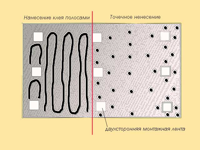 Следующий шаг – нанесение клея на тыльную сторону полотна. Состав наносят полосами или точками. Главное условие – необходимо делать отступ от края изделия, поскольку удалить выступивший клей практически невозможно. В результате внешний вид отделки будет испорчен.