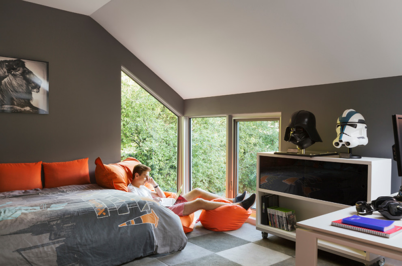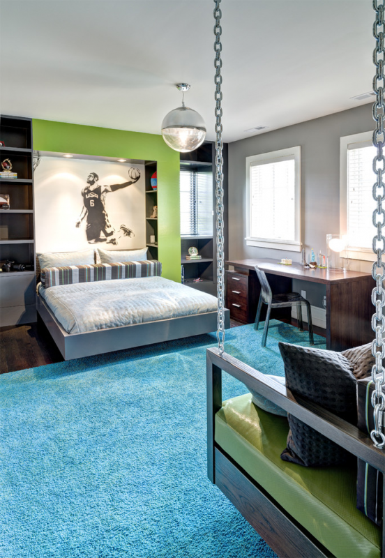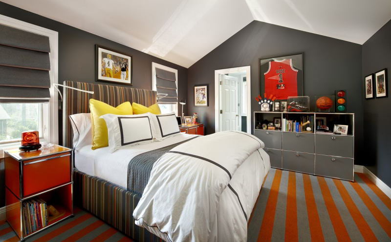 Идеальный ковер в комнату юноши-подростка: безворсовый, однотонный, либо с геометрическим, строгим рисунком. Отдавайте предпочтение прямым, классическим линиям.