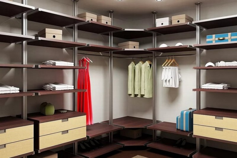 Железный каркас может быть одноуровневым или двухуровневым. Колонные системы удобны для организации зонирования гардеробной, с их помощью можно удачно делить пространство. Минусы – отсутствие ограничений на стеллажах. Открытый тип полок не убережет сложенную стопкой одежду от падения.