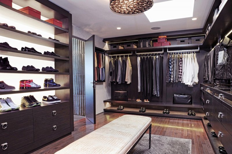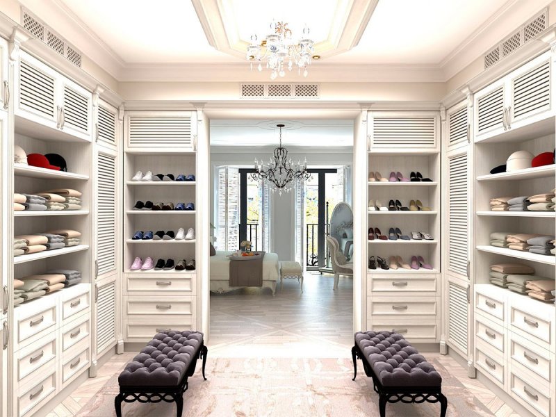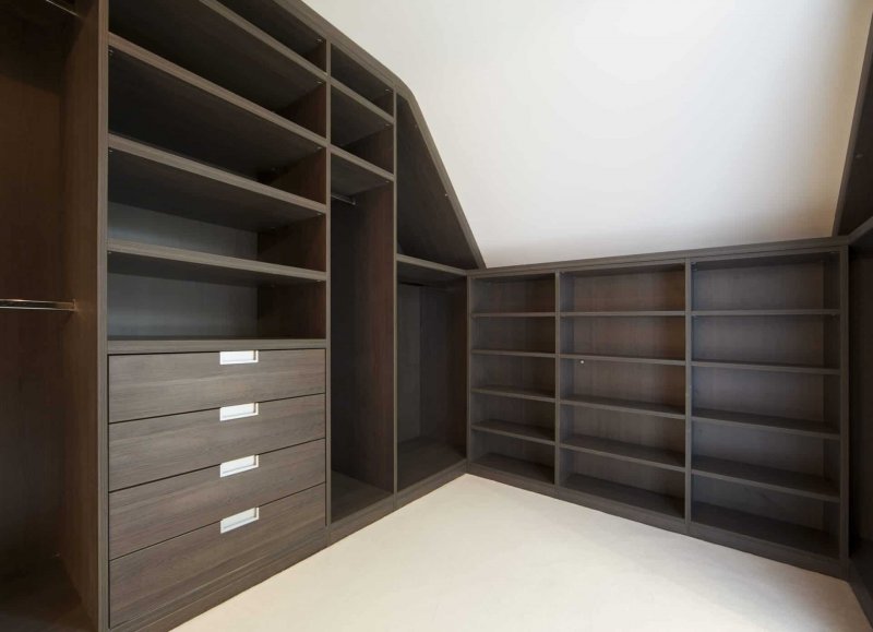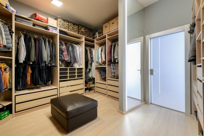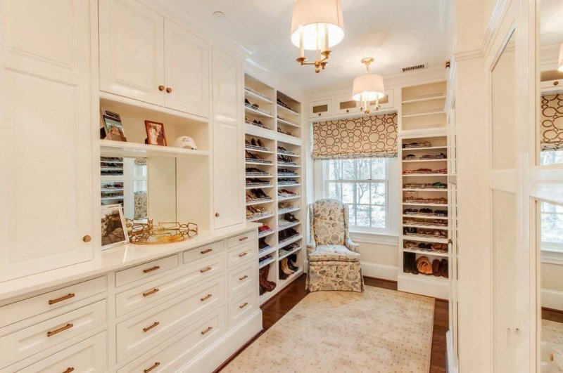 Габариты ниш и полок зависят от количества вещей и размера помещения. Если это бывшая кладовая, пространство необходимо разделить на зоны. В нижней части располагают редко используемые вещи. Этот уровень можно оборудовать выдвижными ящиками для постельного белья, пледов, сезонных покрывал или скатертей. Если эта зона будет предназначена для хранения обуви, ее оборудуют высокими полками.