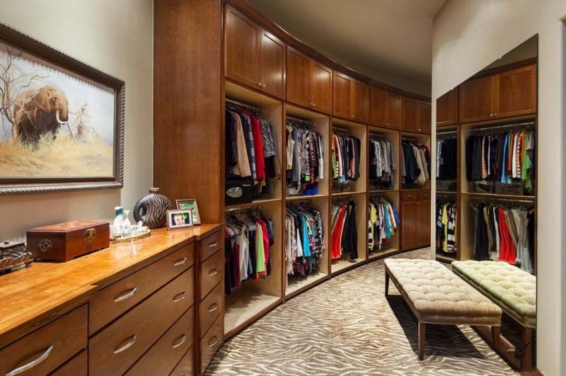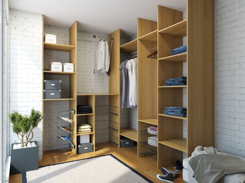 В домах постройки 50-60-х годов часто встречаются ниши прямо в жилых комнатах, что дает отличную возможность для обустройства там системы хранения. Открытые гардеробные в спальне – современный элемент дизайна. Будет достаточно одного угла или пространства вдоль стены, чтобы организовать модную систему хранения. При желании можно сделать текстильный занавес. Такая ширма отлично сыграет роль раздвижных дверей.