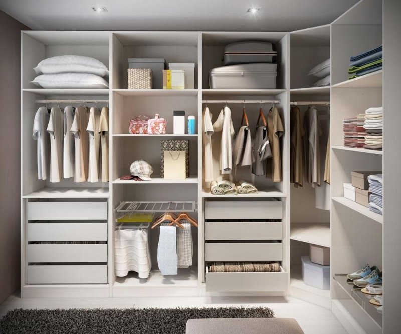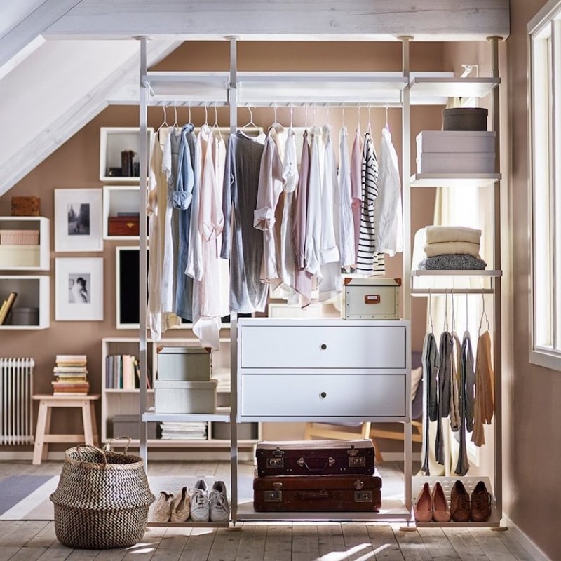Универсальные гардеробы от IKEA отлично впишутся в помещения любых габаритов. Для них подойдет пространство в углу или вдоль стены. Простая конструкция позволяет использовать в качестве дополнения всевозможные рейлинги, штанги, корзины и ящики.