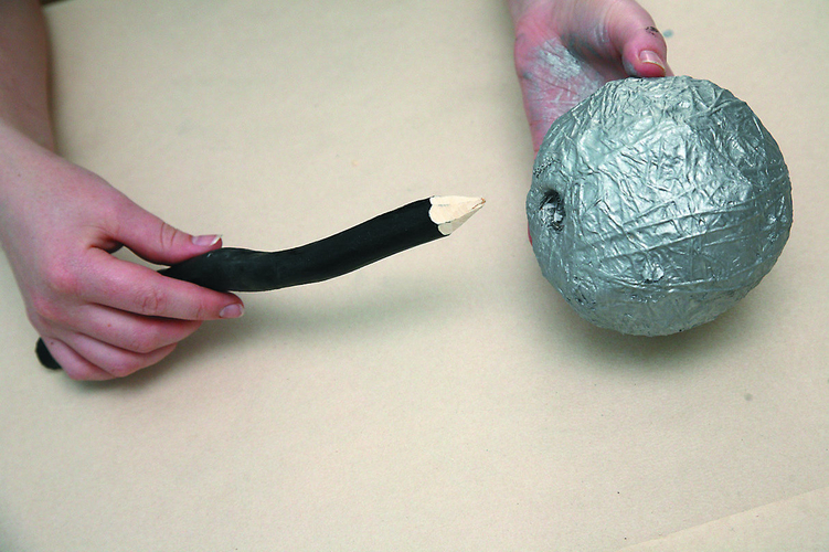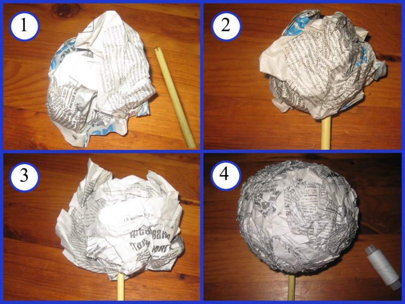Бумага. Промазываем лист клеем ПВА, сминаем в плотный шар. Затем постепенно добавляем бумажные полоски, пока не получится шар нужного размера. Торчащие края приклеиваем и обматываем заготовку плотной нитью.