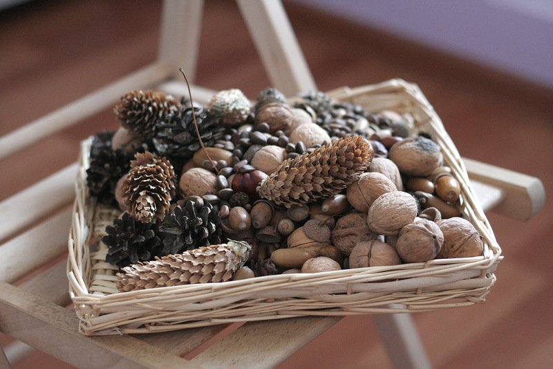 К сбору материала для сезонной поделки можно приступать уже с середины лета. В этот период большинство фруктовых деревьев дают урожай, появляются плоды на каштанах, дубах и елях. Получить достаточное количество косточек, семечек, скорлупок можно, просто побродив по лесопосадке, парку или в собственном саду.