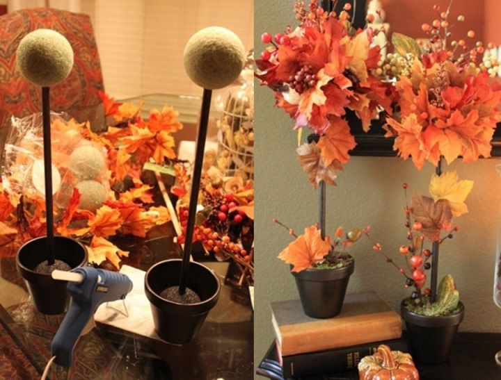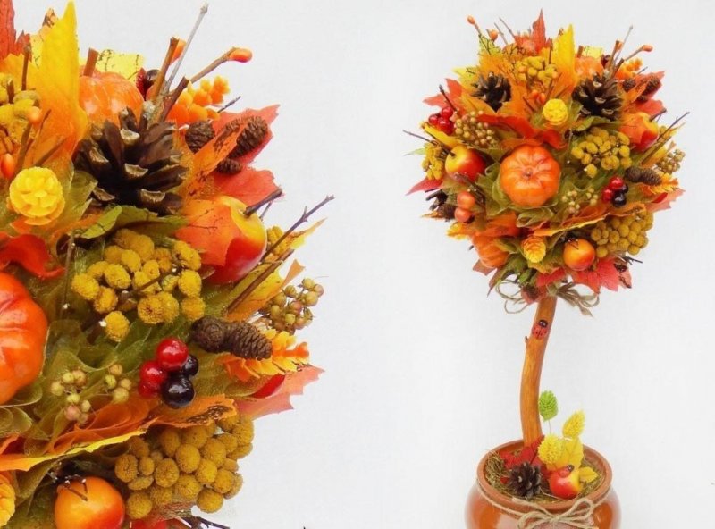 Декоративный топиарий может иметь самую разную форму. Для его изготовления чаще используют круглую основу, но встречаются конусообразные, букетообразные, квадратные варианты. Главный его элемент – крона. Ее можно украшать любыми доступными материалами. Осенняя тема разнообразна и свободна в выборе основных и вспомогательных элементов декора. Не обязательно дожидаться сезона, необходимое для поделки сырье можно найти в любое время года.