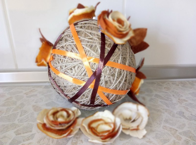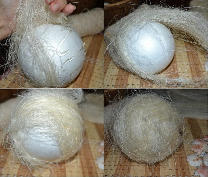 Шаровидную основу для кроны можно купить в магазине или сделать собственными руками. Покупной вариант будет изготовлен из пенопласта. Благодаря огромному ассортименту размеров и степеней плотности, это самый простой способ подбора идеальной формы. Чтобы шар не плавился при контакте с клеем, его обматывают бечевкой.