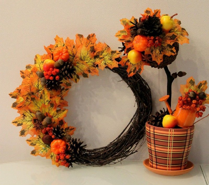 Вдохновение у многих рукодельниц приходит именно во время создания очередного шедевра. Для изготовления осеннего топиария существует множество оригинальных идей. Подходящий дизайн поделки каждый выбирает, ориентируясь на доступность материала, сезон, сложность составления композиции, необходимость обработки элементов.