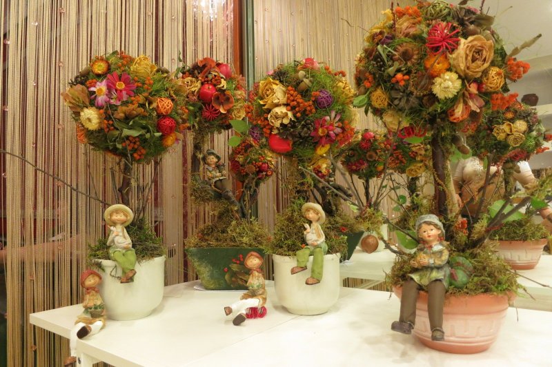 Напомнит об осени деревце из сухоцветов. Для создания топиария подойдут высохшие колоски, красивые листочки, цветы и целые соцветия, коробочки мака и прочие материалы. При желании композицию можно оживить простым окрашиванием.