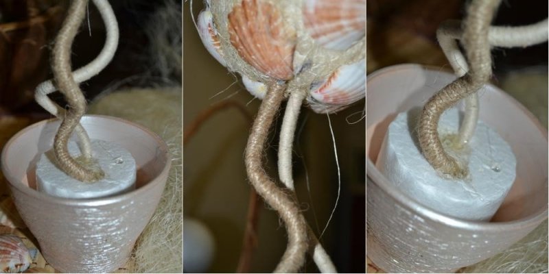 Для придания декоративности поделке голую основу в первую очередь надо обмотать сизалем. Натуральное грубое волокно лучше брать максимально приближенных оттенков к осенней теме. Подойдет коричневый, оранжевый, желтый цвет. Намазываем некоторые участки бечевки клеем и прикладываем материал к заготовке.