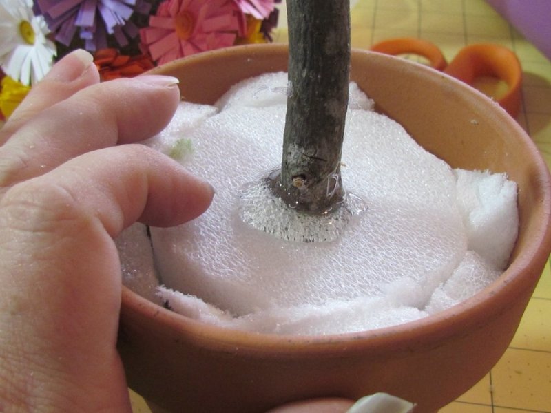 Основание можно быстро сделать из флористической губки. На дно горшка стелим кусочек полиэтилена и укладываем материал в виде полусферы горкой вверх. Вставляем в него ствол и фиксируем место взаимодействия специальной лентой.