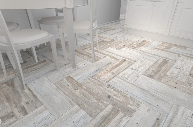 Техника кладки «елочкой» заключается в стыковке узкой стороны материала с широкой стороной другой плитки для образования углов 90 градусов. Правильно подобрав узор, можно сделать прочный плиточный пол с имитацией рисунка ламината, паркета. Такой способ применяют для облагораживания комнат неправильной формы, поскольку рисунок создает оптическую иллюзию и сглаживает разницу в размерах помещения.