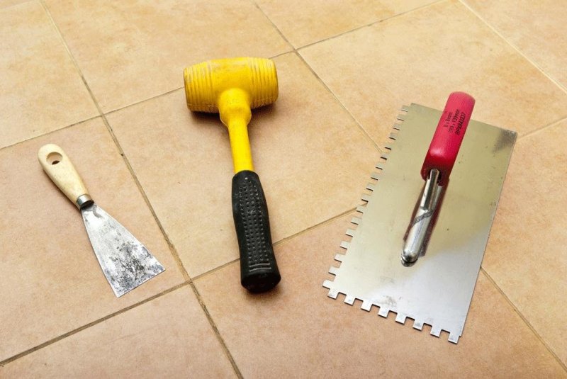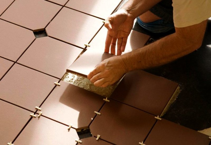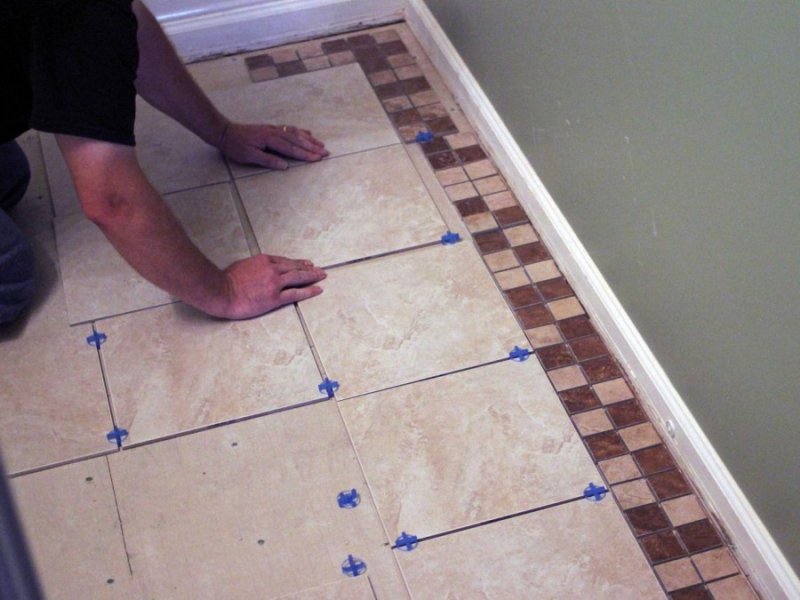 Перед тем как приступать к выкладке плитки, надо обязательно определить уровень пола. Для этого по углам выкладывают маячные плиты, делают стяжку. При необходимости плитку ровняют с помощью резинового молотка.