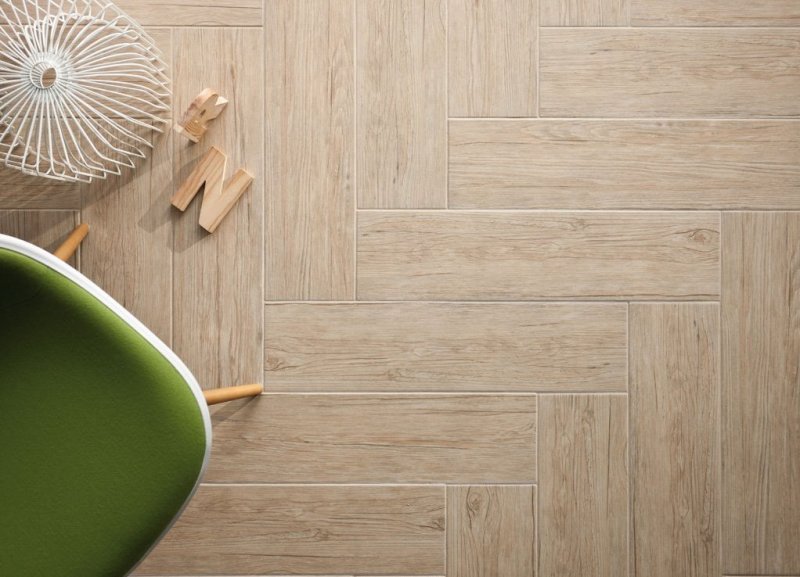 Для укладки используется плитка вытянутой прямоугольной формы с рисунком, имитирующим текстуру палубной доски. Благодаря разнообразию керамических изделий, максимально похожих на древесные материалы, можно использовать любые паркетные раскладки. Конкретно этот способ предполагает прямолинейную укладку с незначительным смещением.