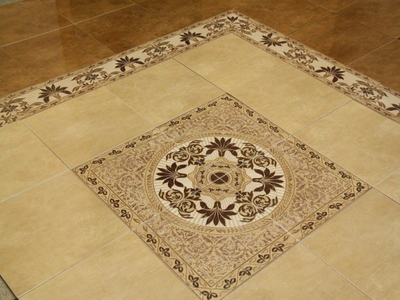 Для создания рисунка из кафеля используют минимум три цвета. Сначала создают эскиз. Если все размеры совпадают по площади с помещением, переносят его на прозрачную бумагу для выкроек и размечают подготовленную поверхность. Затем прямо на полу собирается кафельная облицовка из множества простых и фигурных деталей.