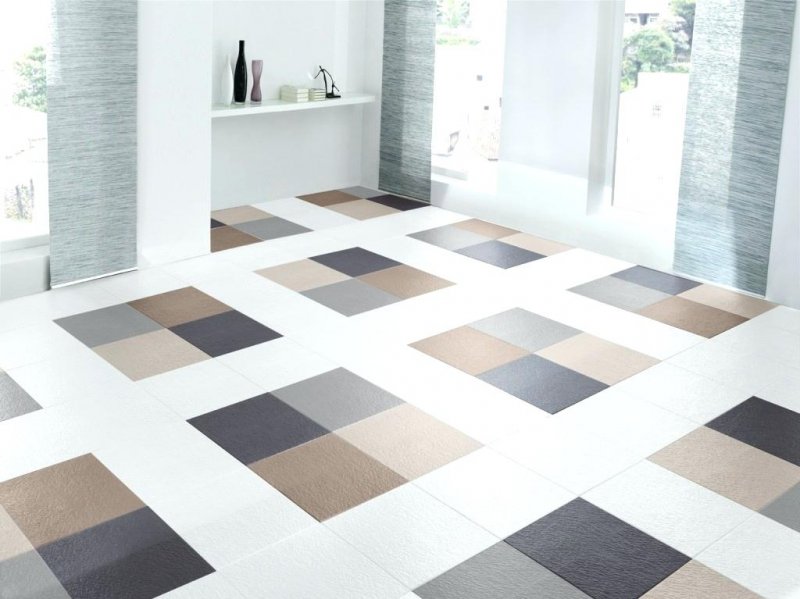 Простой способ является лучшим вариантом для тренировок работы с напольной плиткой. Рисунок из нескольких модулей разного размера смотрится интересно и оригинально. Он будет отлично выглядеть в комнатах маленького размера.