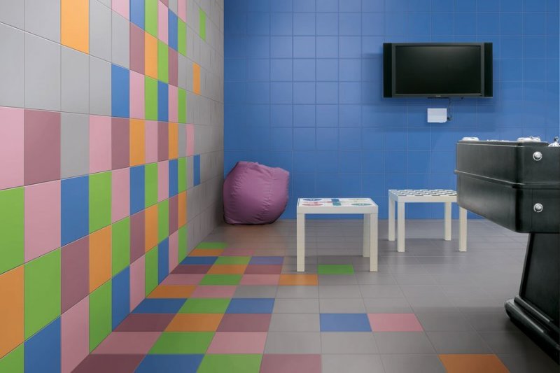 Отличный способ, чтобы создать средневековую атмосферу или скрыть некрасивый уклон комнаты. В рисунке «калейдоскоп» принимают участие одинаковые по размеру элементы, но различные по цвету. Если плоскость большая, лучше выбирать оттенки из одного спектра, максимум можно прихватить соседние. Главное – чтобы контраст получился мягким. Необходимо, чтобы пропорциональное количественное соотношение всех плиток было одинаковым. Для этого общее количество участвующих модулей делят на количество цветов.