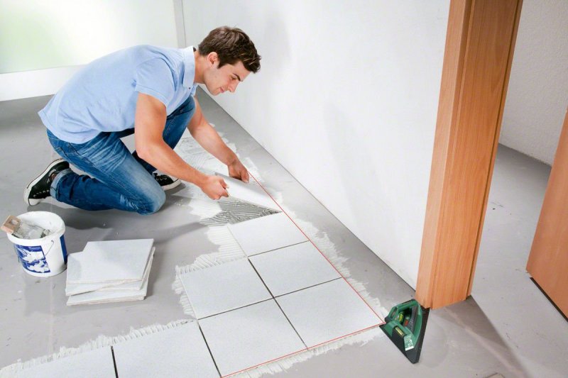 Специалисты рекомендуют начинать укладку плитки от центра, а не от стен, поскольку так можно минимизировать вероятность погрешностей. Для выполнения разметки пола лучше использовать лазерный уровень. С его помощью можно начертить достаточно точных линий, не перемещая прибор.