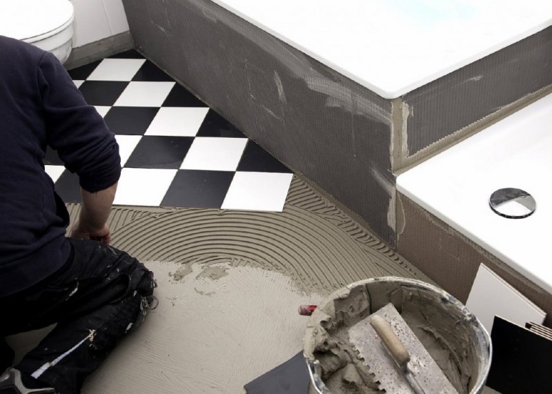 Перед укладкой плитки на бетонную основу надо нанести гидроизоляцию, особенно если помещение будет подвергаться воздействию влаги. Это может быть рулонная самоклеящаяся пленка или битумная мастика. Сам процесс укладки плитки проходит с помощью специальных пластиковых крестиков для швов. Готовый клей наносят на бетон и на саму облицовку зубчатым шпателем, соединяют материалы и слегка придавливают.