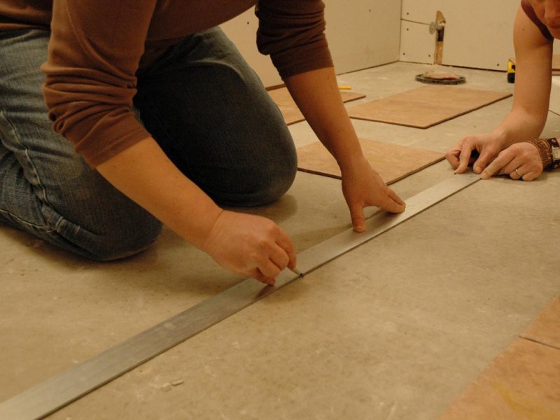 Укладывать материал можно только на ровный чистый пол, дверные наличники и плинтус надо снять. Работать проще по направляющим линиям. Образовавшийся зазор между крайним рядом кафеля и стены можно скрыть плинтусом или придется приклеить керамическую полосу.