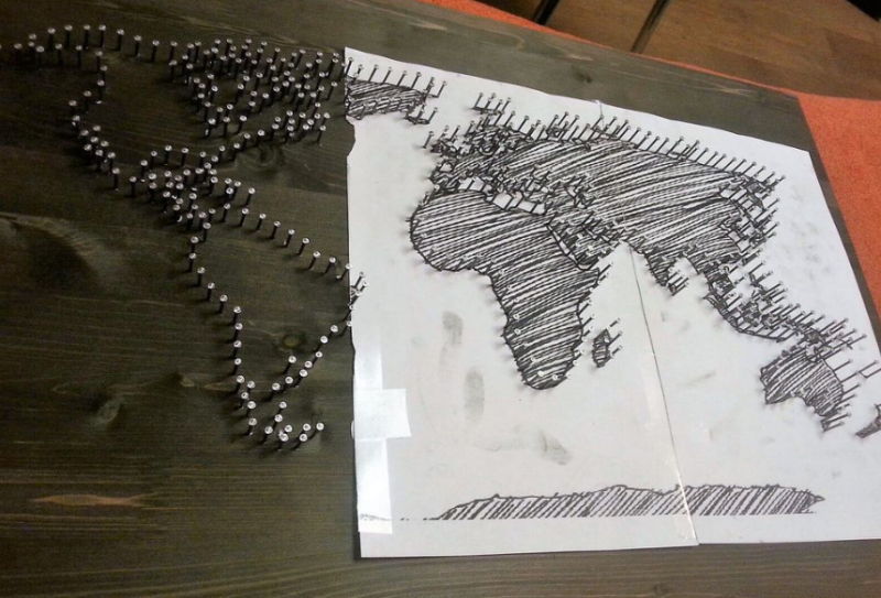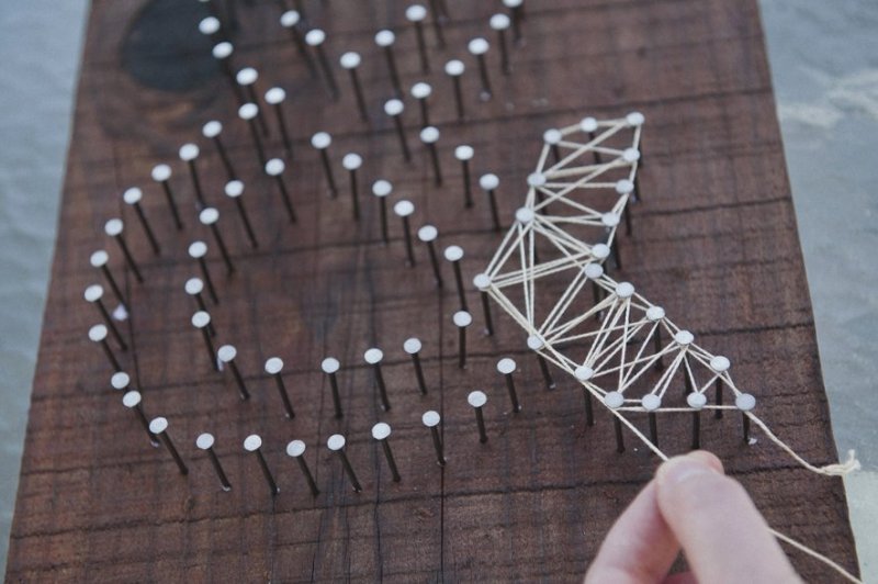 Все гвоздики вбиваются на одинаковую глубину, на равном расстоянии друг от друга. Высота выступающей над поверхностью части – пять-девять мм. При вбивании гвоздиков используют небольшие щипцы, пассатижи – так меньше шансов повредить пальцы. После того как картина завершена, гвоздики допустимо вбить глубже, хотя это вовсе не обязательно.