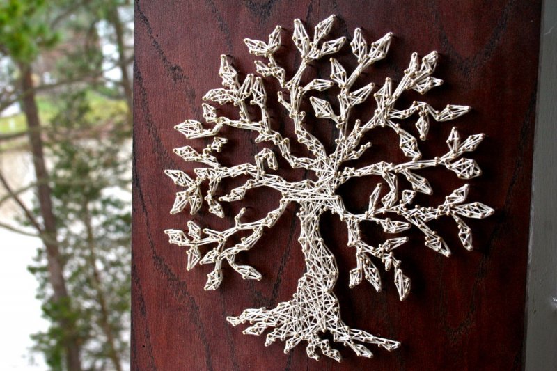 Деревья в технике стринг арт делаются схематичными либо более правдоподобными. К деревцам, в данном случае, относят как отдельные ветки, так и целый нитяной лес. Подобное панно выполняется черно-белым либо многоцветным. Это дуб или баобаб на зеленовато-коричневом фоне, зеленая елка среди заснеженных лесов, схематичный эвкалипт, «набитый» прямо на стенке. Интересно смотрится дерево с густой кроной, выполненное на покрытой темной морилкой доске, где хорошо просматривается текстура древесины. Здесь тонкими нитями заполняется фон, а основной элемент оформляется бумажными листочками, яблочками, вишенками, желудями.