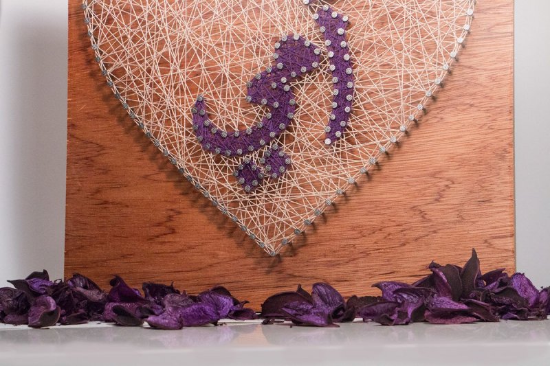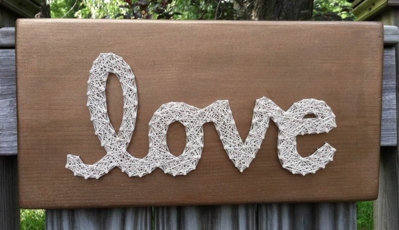 Сердечко – одна из самых простых деталей, после круга, квадрата, дуги. Готовое изделие станет отличным подарком на День Влюбленных, украсит спальню, гостиную, детскую, выполненную в романтическом стиле. На бумаге или самой доске аккуратно рисуется сердце, на полученной линии проставляются точки, с шагом около одного см. В последние вбиваются гвоздики, линия стирается ластиком. Работа с нитками начинается с завязывания узелка в нижней части сердечка. Обмотка производится под острым углом. Есть и другой вариант исполнения задумки – нитяной «паутиной» заполняется фон, само же сердечко окрашивается красным, оформляется текстильной либо бумажной наклейкой.