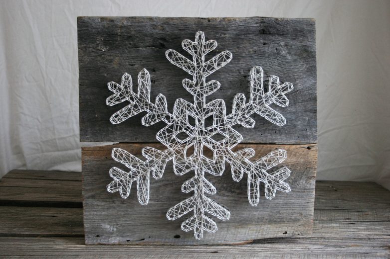 Снежинка – популярнейшее украшение на Новый год и Рождество. В технике String Art ее выполняют так: