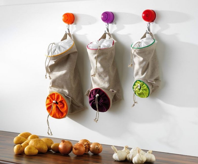 Что-то подобное на вертикальные системы с карманами для цветов используют и для хранения овощей и фруктов. Цветные хранилища выглядят современно и стильно, а прозрачные — более практичные. Продукты держат также в экомешочках и экосумочках. Для томатов делают непромокаемые герметичные мешки. Грязные овощи вроде моркови хранят в карманах из плащевки. Для бобовых обычно выбирают хлопчатобумажные. Огурцы, капусту и прочее кладут в изделия из подкладок, тюлей, органзы, фатина, шифона, спортивной сетки. Первым делом определяют размер карманов и готовят выкройку. После вырезают детали в нужном количестве и соединяют боковые срезы двойным швом. Прямоугольники складывают, а боковые швы приметают или скалывают. Их стачают за 0,3—0,4 мм от срезов. С одной из сторон до верха не доходят и оставляют 3 см запаса. После этого строчат мешочек и обрабатывают кулиску.