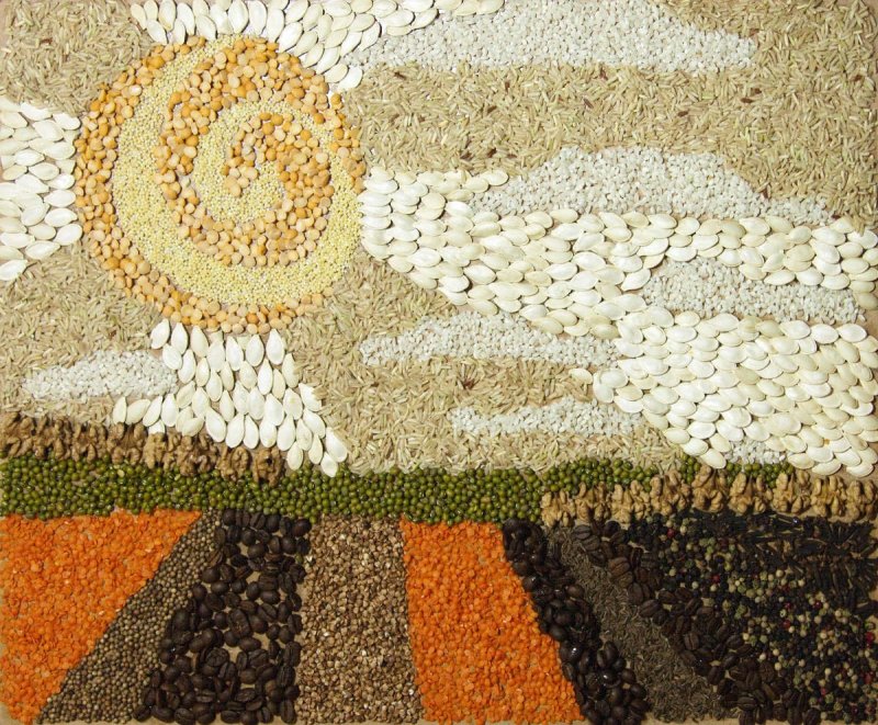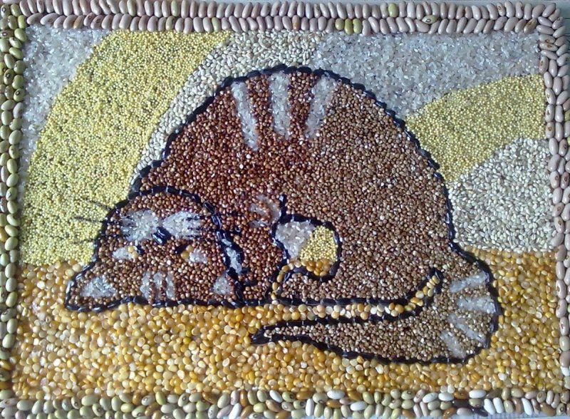 Из круп, семечек, орехов, зерен кофе и даже из кокосовой стружки создают композиции. Их предварительно рисуют, а потом отдельные фрагменты наполняют разным по фактуре содержимым. Мозаичные панно для стен и фартука — результат длительной работы с подбором цветов и оттенков. Обычные квадратные аппликации складывают с периметром из крупных частиц, округлым рисунком по центру и фоном из мелкой крупы. Фрагменты фиксируют клеевым пистолетом, теоретически клеем «момент», но тогда получится очень долго и не так надежно. Плотные композиции мастерят с применением красок в один тон. Пробелы с пигментами будут незаметными. Готовые поделки лакируют. Из кофейных зерен получают красивые фигурки животных. Поделки наносят на стены, ткани, декоративные салфетки из бумаги и текстиля. Перед основным этапом создают тренировочную формочку в виде животного: рисуют или вырезают.