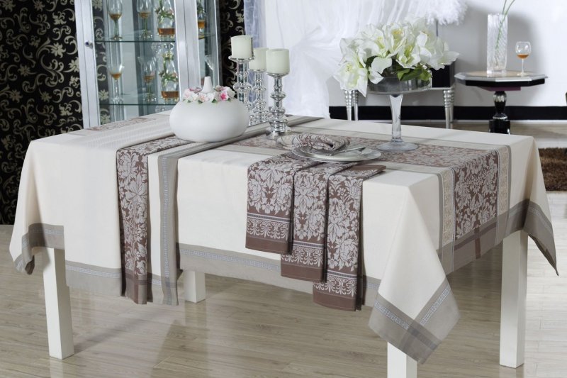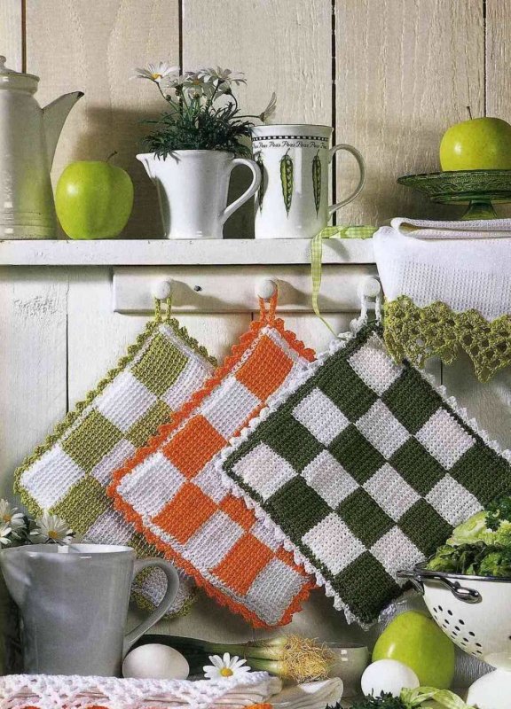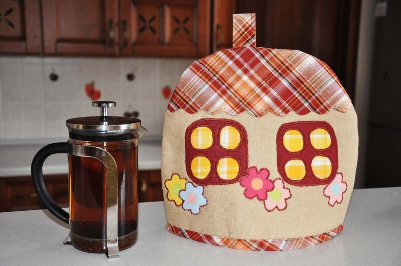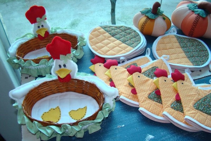 Создание таких поделок заинтересует домохозяек. Оформление тканями — логическое продолжение общего дизайна: важно соответствие цвету и фактуре занавесок, а также отделки из текстиля. Старые ткани и фрагменты материй, одежды превращают в прихватки, чехлы и куклы на чайники, карманы, скатерти и тканевые салфетки. Мебель одевают в чехлы, на стулья кладут подушки для сидения. Из текстиля шьют корзинки для хлеба и фигурки животных под хранение небольших продуктов. На стены вешают картины из текстиля на любую тематику. Обстановку можно обыграть, например, создать различные натюрморты из фруктов, овощей или блюд. Кухонную утварь иногда складывают в мягкие карманы. Подоконники украшают вазонами в виде самодельных композиций из органзы. На кухне прекрасно выглядят и гармонично сливаются с обстановкой легкие тканевые светильники.