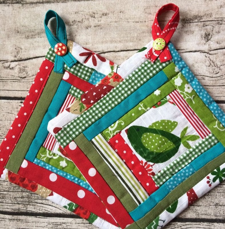 Кухонные варежки делают из натуральных тканей с добавлением наполнителя вроде фетра, ватина, синтепона или драпа. У синтепона высокая теплопроводность, поэтому выбор лучше остановить на остальных материалах, и чем плотнее будет конкретный образец, тем лучше. Рюши, аппликации и вышивки украсят готовое изделие. Самих способов шитья много, но суть сводится к использованию 4 фрагментов ткани и 2 кусков наполнителя. Сначала делаем выкройку: кладем ладонь на бумагу (или сразу на ткань), и с расстоянием в 2,5—4 см от пальцев рисуем контуры прихватки. Потом вырезаем 2 подкладки и столько же фрагментов лицевой ткани. Для изнаночной стороны выбираем ткань помягче, а для лицевой — более плотную и разрисованную. Из наполнителя вырезаем куски такой же формы. Создаем трехслойные детали с набивкой внутри и строчим края с припуском в 5—7 мм. Затем сшиваем их, удаляем торчащую ткань и выворачиваем изделие. В конце делаем украшающий кант.