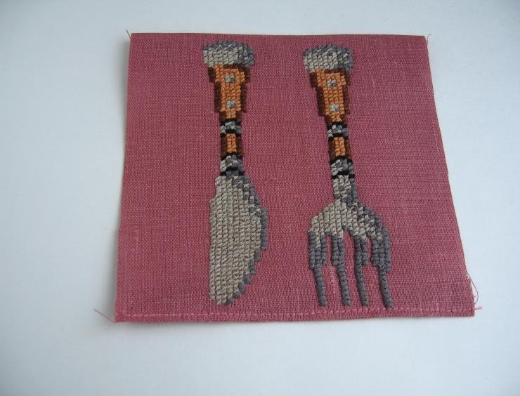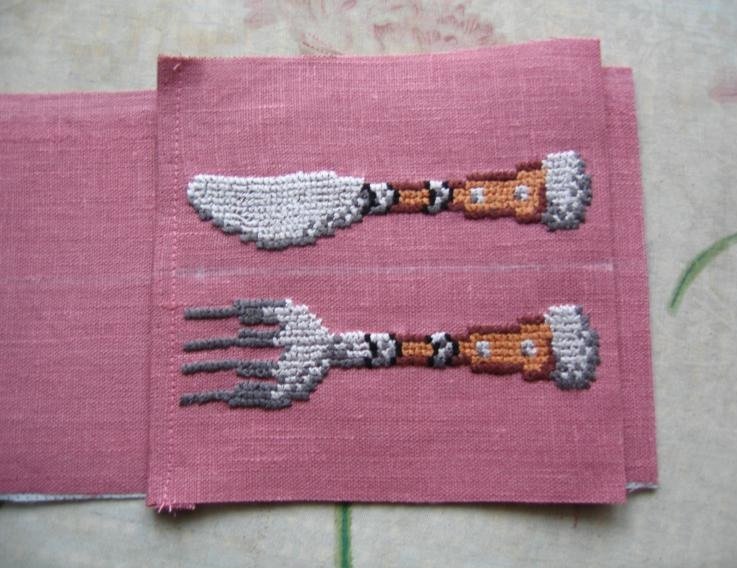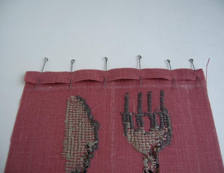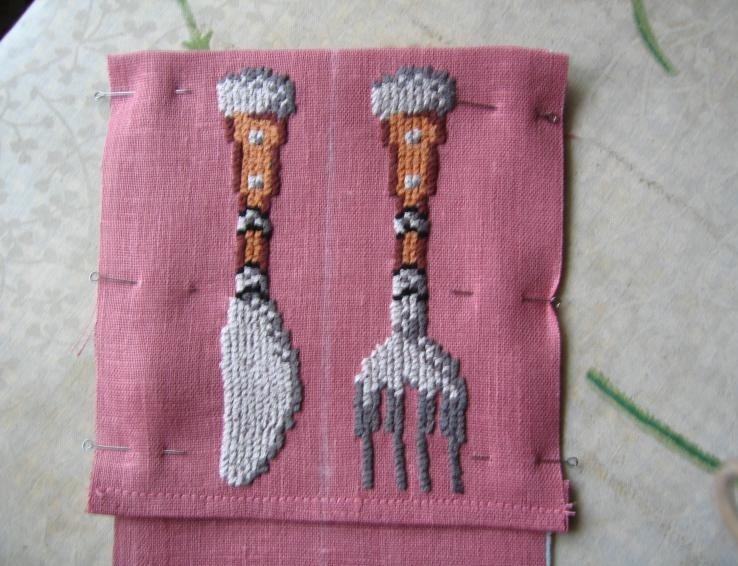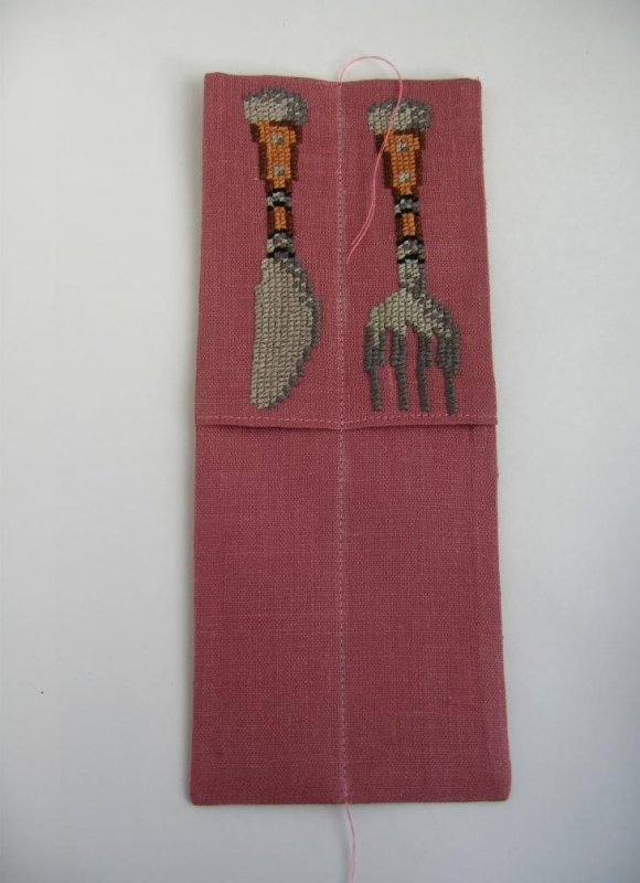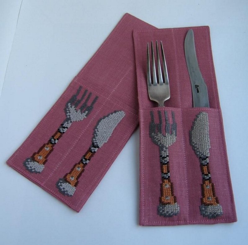 Всего нужно 3 фрагмента: карман размером 13x17 см, подложка со сгибом, 13x53 см, и кусок флизелина — 13x53 см. Припуски отмечаем мелом. На изнаночной стороне прикладываем флизелин и утюжим. На детали кармана оформляем отворот. Делаем сантиметровый припуск на изнаночную часть, приметываем или прикалываем булавками, разглаживаем. Отворачиваем запас 1,5 см наизнанку и делаем то же самое, после чего строчим рядом с отворотом. Припуск под нижний противоположный шов заглаживаем, тоже наизнанку. Дальше утюжим припуски подложки. Размечаем середины деталей, где будет шов-разделитель. Декорированный вышивкой карман кладем на лицевую часть подложки, прикладывая припуски и середины фрагментов. Припуск кармана загибаем поверх подложки, прикалываем булавками. Затем прослойку складываем вдвое, лицом внутрь. Прикрываем таким образом карман и совмещаем края. После этого строчим детали — поделка готова.