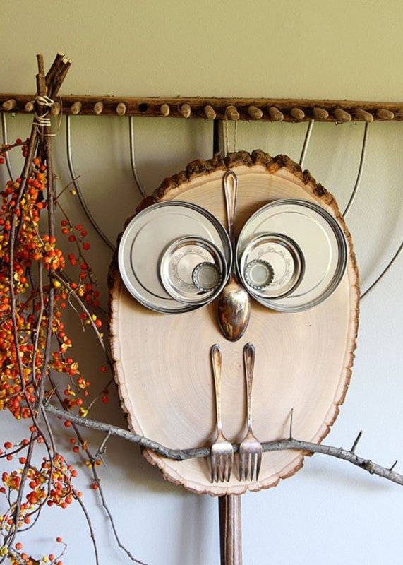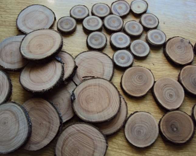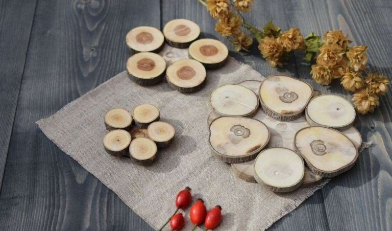 Из срубов делают полезные вещи вроде разделочных досок, подстаканников и подсвечников. Также собирают различные композиции — объемные из пеньков, длинных фрагментов и плоские из тонких спилов. Большое круглое панно украсит пустующую стену. Объемные изделия на сказочную тематику собирают из множества разнообразных фрагментов. Более крупные массивы переделывают в декоративные столешницы и сиденья. Мастера превращают материал с широким диаметром в подставки под большие блюда, настенные часы. Всего одной более-менее прочной ветки хватит, чтобы смастерить этажерку на 3—4 спила. Срубы до 4 см в ширину можно сложить во что-то похожее по размеру на горшок. Всего несколько часов работы с клеевым пистолетом, и на кухонном подоконнике можно будет поставить ряд из вазонов. Из спилов чаще всего делают подстаканники.