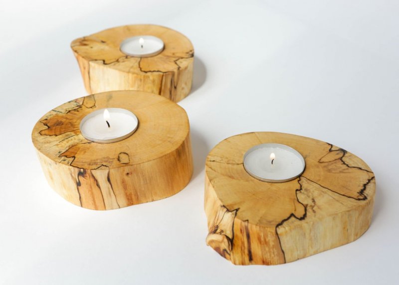 Сам по себе спил уже готов для того, чтобы стать основой подсвечника. Речь идет о срезах более 10 см в высоту. В них проделывают отверстия, в которые вставляют свечи по размеру. При этом выдерживают запас около 2 см от верха или, напротив, делают возвышение над спилом — от этого и зависит декоративный эффект. Сервировочные элементы изготавливают в том числе из магазинных вариантов. В лавках с авторским хендмейдом продают качественные срубы без трещинок и сколов. Они уже просушены и отшлифованы. Остается только выбрать высоту, диаметр и породу дерева, возможно подобрать еще бревен для создания большой композиции. В приобретенном срезе делают ячейку для свечи — дрелью со сверлом Форстнера либо любым другим, способным прорезать глухое или сквозное отверстие большого диаметра. Среди таких наконечников могут быть: