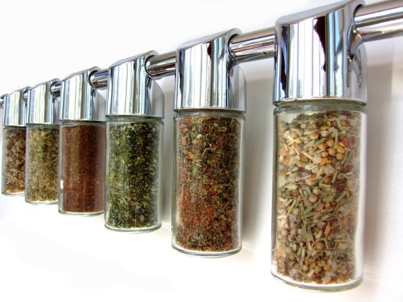Из обычной стеклянной тары и крышек с прорезями делают емкости для специй. Приправы иногда хранят и в открытых банках. Из сырья делают оригинальные самоделки, и для этого понадобятся минимальные навыки рисования. Первым делом моем стеклянную поверхность. Потом протираем ее спиртом и наносим краски: на открытое стекло или по формам на трафарете. Во втором случае фон будет пустым, но его можно дорисовать медленными выверенными движениями. Самые красивые рисунки делают витражными красками. Другой вариант украшения предусматривает поклейку ленты. Вначале измеряем нужное количество полоски, обмотав ею баночку. Отрезаем нужный кусок, и делим на отрезки по окружности банки. Смазываем внутреннюю сторону полосочек клеем ПВА. Приклеиваем их поочередно к стеклу и аккуратно разглаживаем. Края каждого отдельного фрагмента соединяем внахлест. Покрытие декорируем блестками или небольшим рисунком.