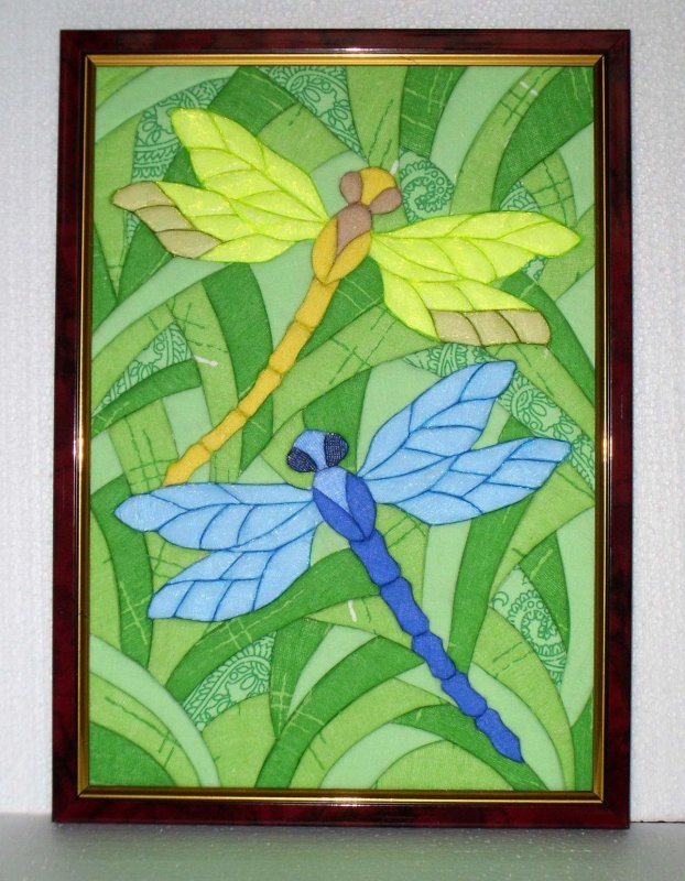 При работе нужно все делать аккуратно – вырезать детали строго по контуру, наклеивать их так, чтобы клей не размазался. Понадобится фон – однотонная ткань, натянутая на картонку, при желании часть элементов прорисовывается на нем вручную. В такой технике создаются объемные насекомые, птицы, букеты цветов, дикие травы, парусники, целые деревеньки.