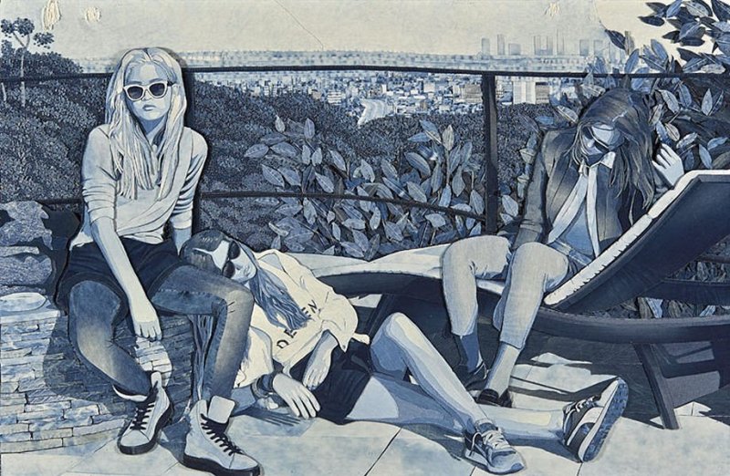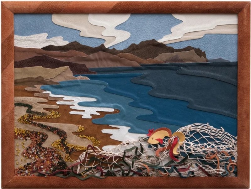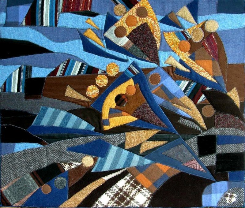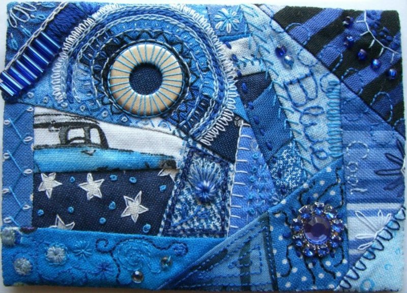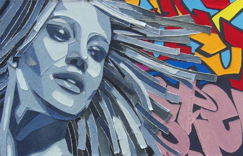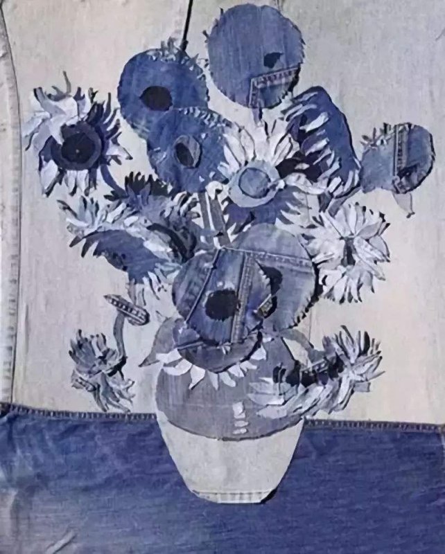 Джинса – удобный в пошиве, всегда модный материал, имеющий широкий спектр оттенков. Благодаря многообразию тонов, обилию джинсовых строчек, из такого текстиля возможно создать невероятно реалистичные панно, совсем не похожие на традиционное лоскутное шитье. Большинство картин выполняются в технике «деним на дениме», а выцветшие от времени фрагменты используются наиболее часто, так как имеют красивые полутона. Популярная тематика здесь – урбанистическая, морская, а также абстракции. Наиболее красиво смотрятся джинсовые надписи на темном либо светлом фоне.
