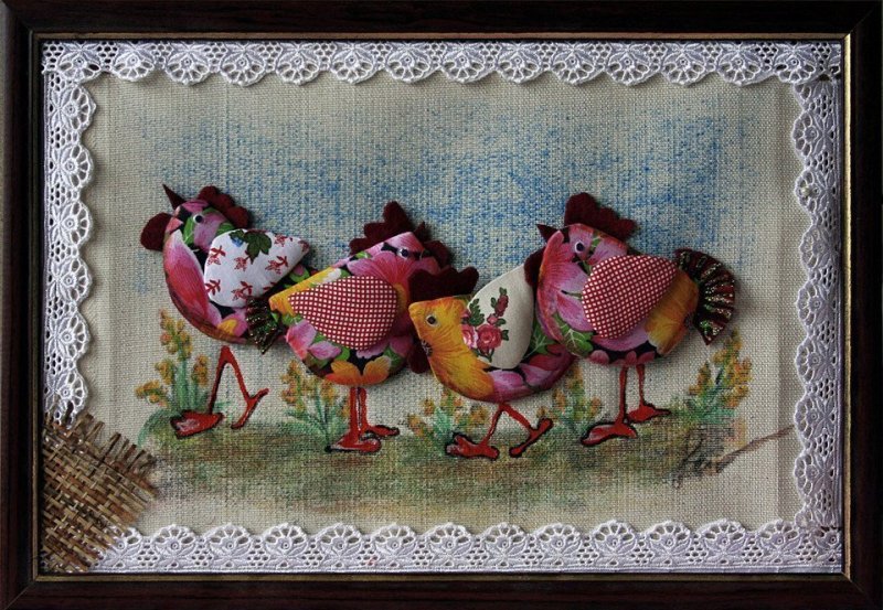 Для подобного произведения не обязательно делать жесткую основу – если между слоями проложить тонкий поролон, синтепон, предмет будет отлично держать форму, особенно, если размеры его невелики. Наиболее уместны подобные картинки в интерьерах прованс, кантри, скандинавском.