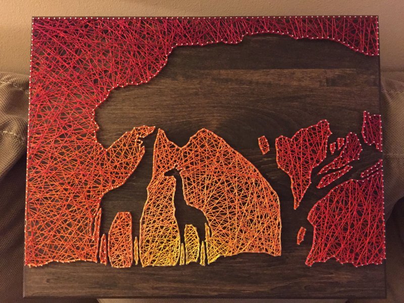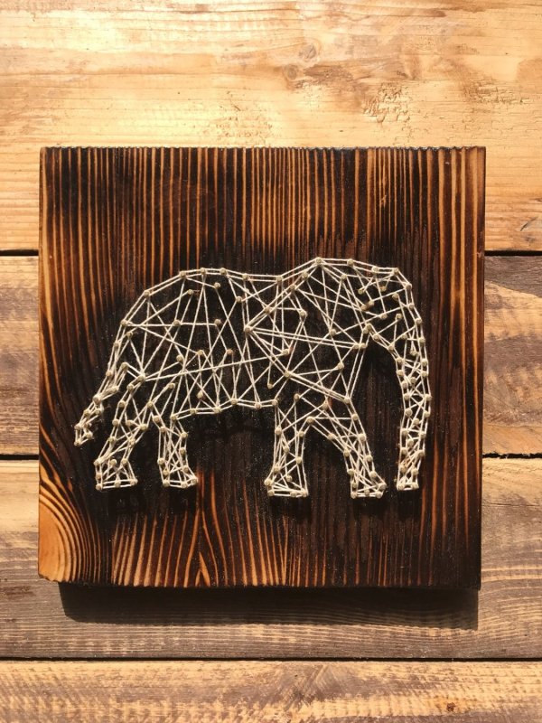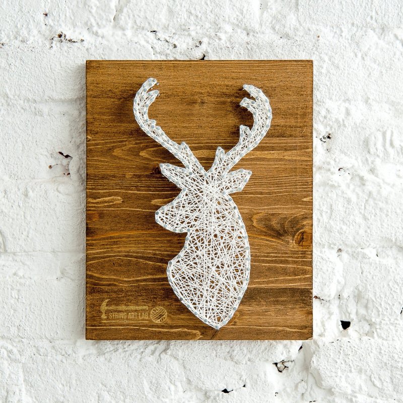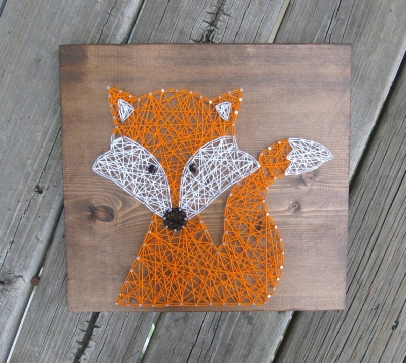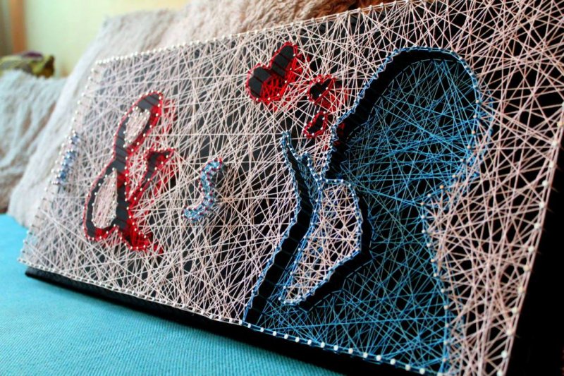 Техника стринг-арт – оригинальнейший способ создания изображений при помощи сотен гвоздиков, вбитых в доску, ниток, натянутых на них. Чтобы создать подобное произведение, для начала ознакамливаются с вариантами заполнения основных элементов – углов, окружностей. Нитки допустимо использовать любые, но прочные – натягивать их придется сильно, иначе со временем они провиснут, изделие потеряет внешний вид. Набиваются гвоздики на расстоянии 0,6-1,2 см друг от друга. Изделие выходит прозрачным, потому для него необходим контрастный фон.