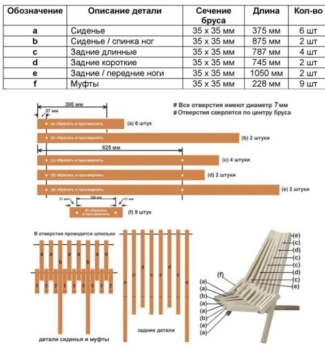 Еще понадобятся бруски для длинной и короткой частей спинки по 4 и 2 шт. соответственно, брусья для сиденья — 6 шт., для передних и задних ножек — по 2 шт., а также 9 соединительных деталей. Размеры одинаковых по типу элементов подбирают идентичными с точностью до миллиметров.