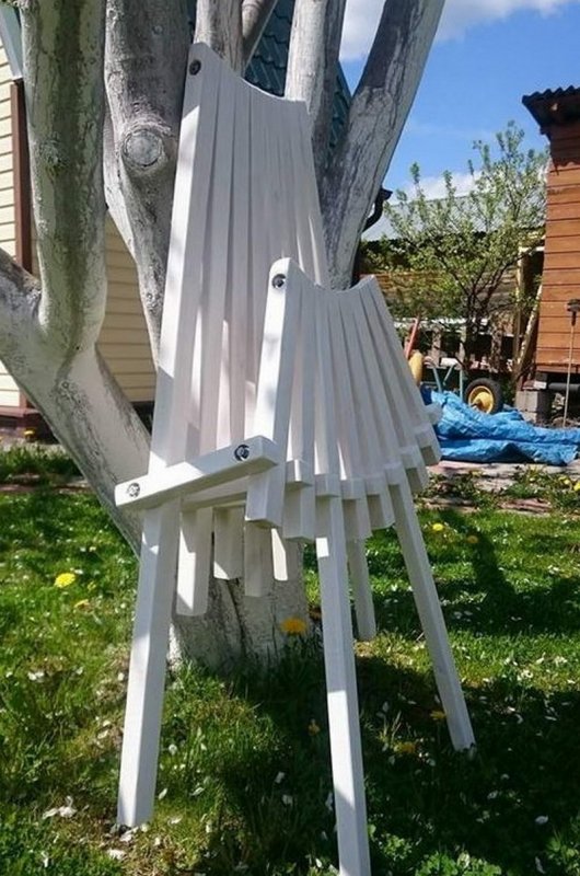 На этапе сборки элементы спинки накладывают на детали сиденья. Верх спинки должен приходиться на перед сиденья, а низ — на зад. Бруски спинки при этом лягут на детали сиденья. Затем поочередно раздвигают переходные бруски спинки-сиденья и раскрывают мебель подобно вееру. Между брусками фиксируют детали спинки. Потом проволокой край переходных брусьев соединяют с нижней частью спинки.