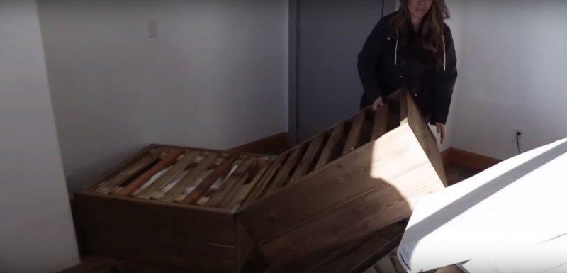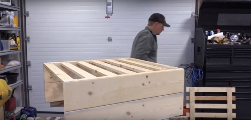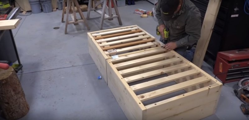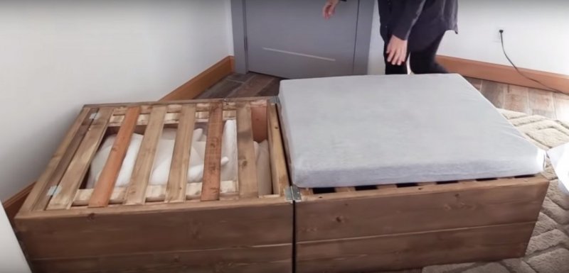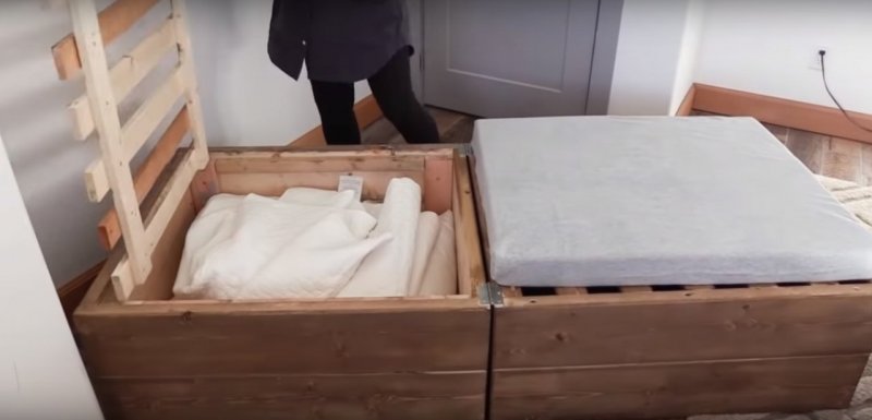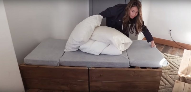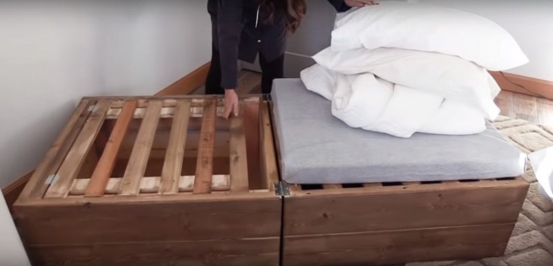 Нужно подготовить бруски, доски, саморезы, петли, раздвижной механизм и наждачку, а также ткань, так или иначе пригодную для обивки кровати, к примеру, экокожу.