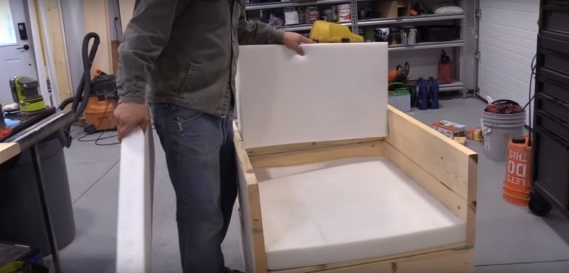 Первым делом определяются с деталями. Обычно это — два идентичных элемента для сиденья (по 700x700x150 мм), два одинаковых небольших отрезка для подлокотников (по 700x250x150 мм) и подушка для спинки (400x250x150 мм). Когда решают этот вопрос, переходят к раскрою поролона. Исходя из описанных размеров, подушки делают толщиной 150 мм. Ради экономии изделия шьют трехслойными — из 3-х листов по 50 мм. Один в 150 мм обойдется дороже. В дальнейшем сшивают подушки с помощью цыганской иголки. Потом наметывают чехлы, делают первую примерку и сшивают их. После этого поочередно формируют сиденье, подлокотники и спинку.