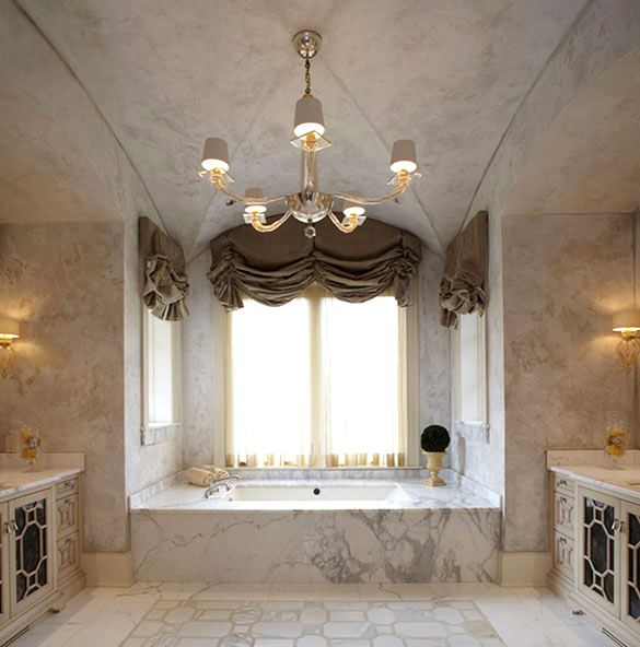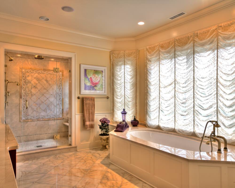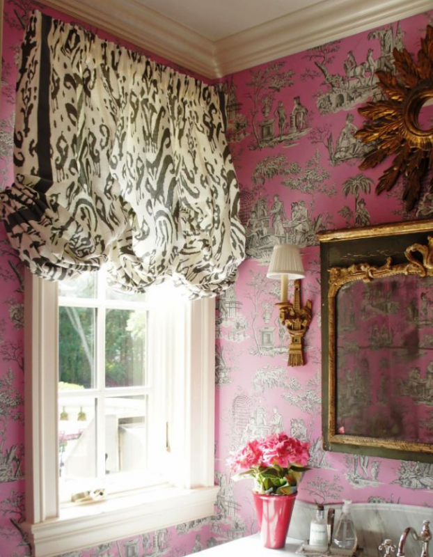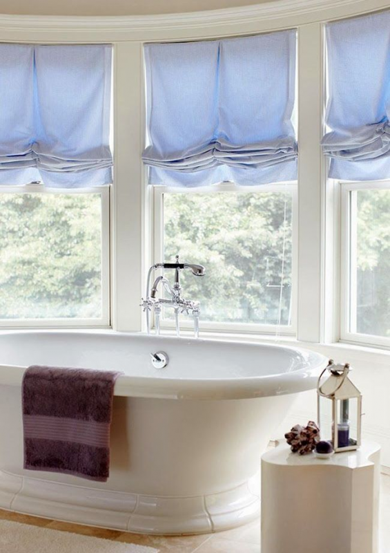 Можно использовать «австрийки» и в санузлах. Если ванная комната столь просторна, что в ней есть окно, требующее эффектного оформления, такой тип оконного текстиля окажется как раз кстати.