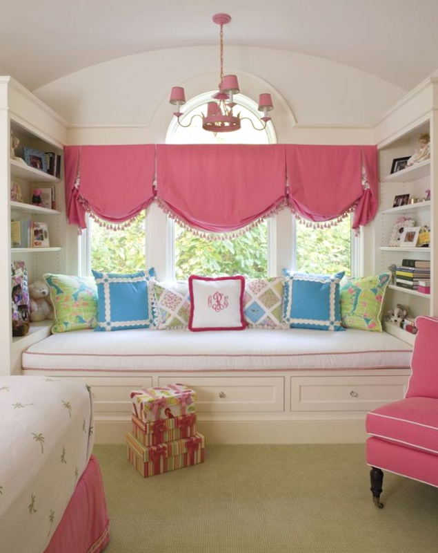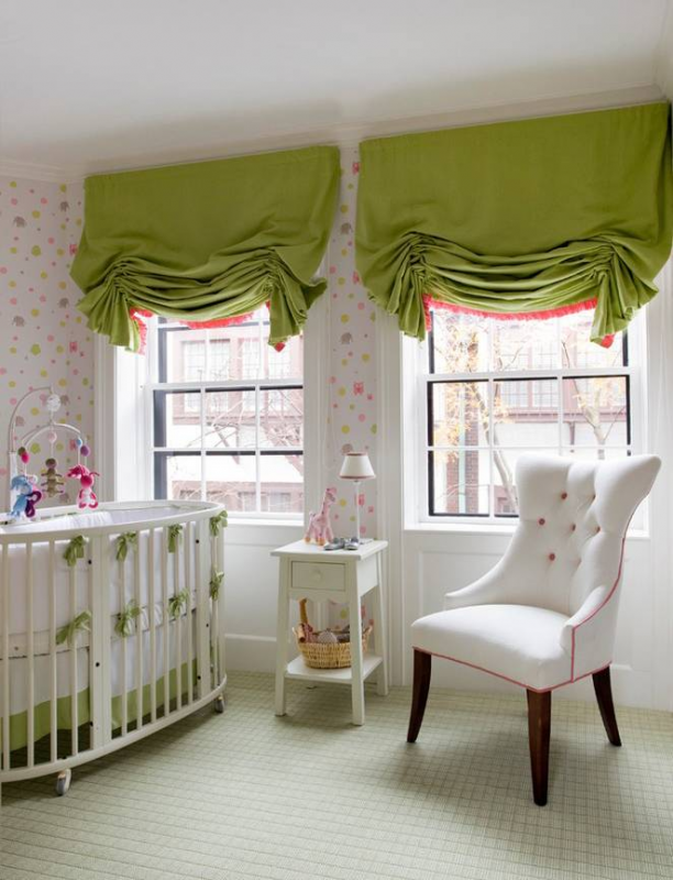 Очень здорово выглядит такая «одежда» для окон в детских. Если украсить нижний край шторы дополнительным декором (например, оборочками, бантиками и ленточками), это добавит помещению нежности.