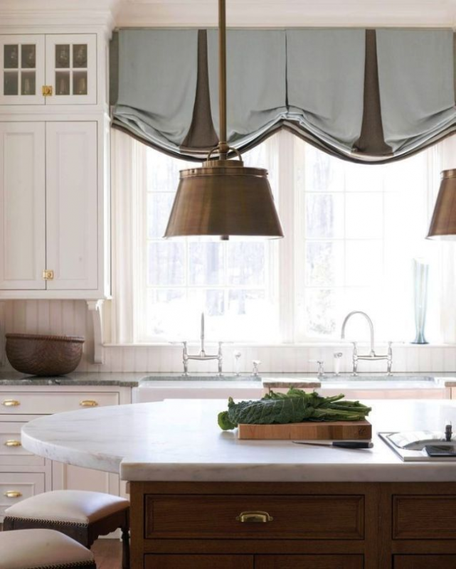 Особенно популярны австрийские шторы для кухни. Так как это помещение с относительно агрессивной средой (одни только брызги и пятна чего стоят!), украшать его помпезными портьерами до пола мало кто решается. Именно поэтому длины австрийских штор, которые крайне редко опускаются ниже линии подоконника, оказывается как раз достаточно, чтобы и не пачкаться, и выглядеть нарядно.